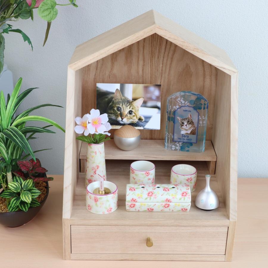 引き出しと収納のついたコンパクトな仏壇と仏具のトータルコーディネートセット ペット 仏壇 ペット仏壇仏具セット 陶器製仏具5点セット おりん お供え花と引き出し 収納付のメモリアステージ仏壇 ペット 祭壇 ペット仏壇 ペット 祭壇 手作り ペット 仏具 ペット供養